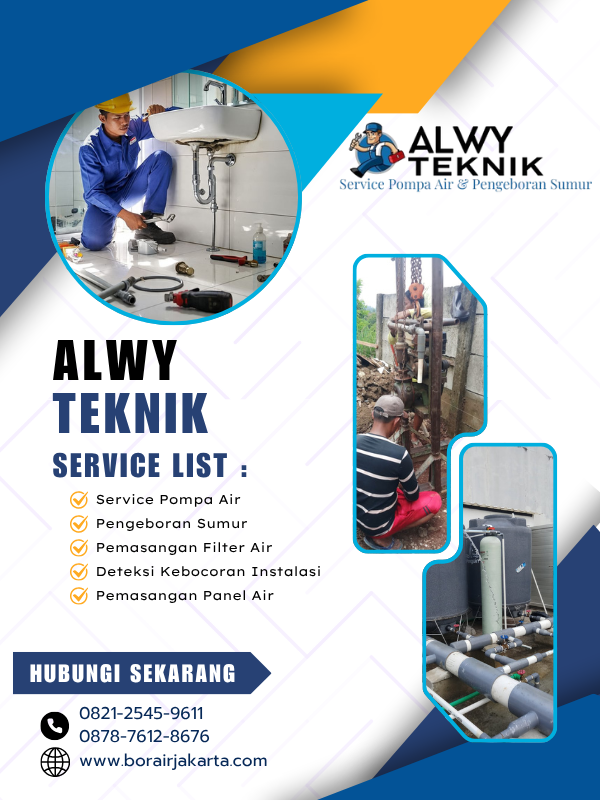 Alwy Teknik adalah penyedia layanan profesional yang bergerak di bidang service pompa air dan jasa pengeboran sumur, dengan pengalaman bertahun-tahun melayani kebutuhan air bersih masyarakat, baik untuk rumah tangga, bisnis, maupun instansi.